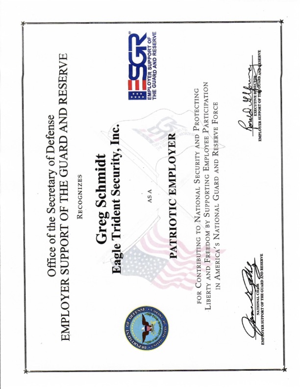 Eagle/ Trident Security is proud to be recognized as a Patriotic Employer by the Office of the Secretary of Defense, Employer Support of the Guard and Reserve Division.